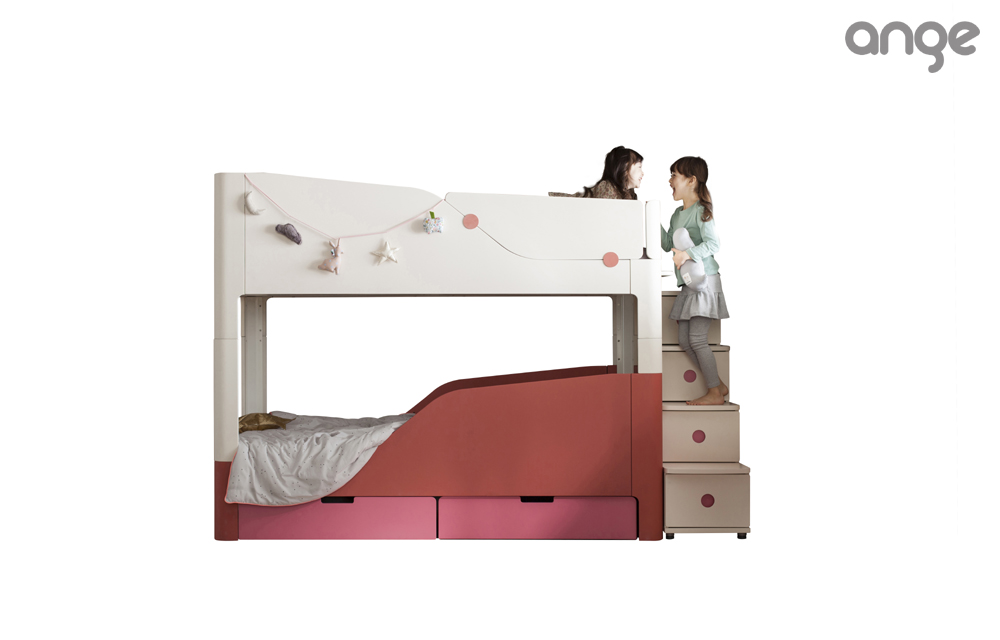 두 아이가 함께 사용할 수 있는 2층 침대로 침대 아래와 계단에 수납장을 더하면 효율적으로 공간을 활용할 수 있다. 아이가 자라 독립된 공간을 원하면 각각 분리해 일반 침대로 사용 가능하다. 195만 5,000원(매트리스 미포함), 침대 서랍 6만 5,000원 일룸(1577-5670, www.iloom.com)